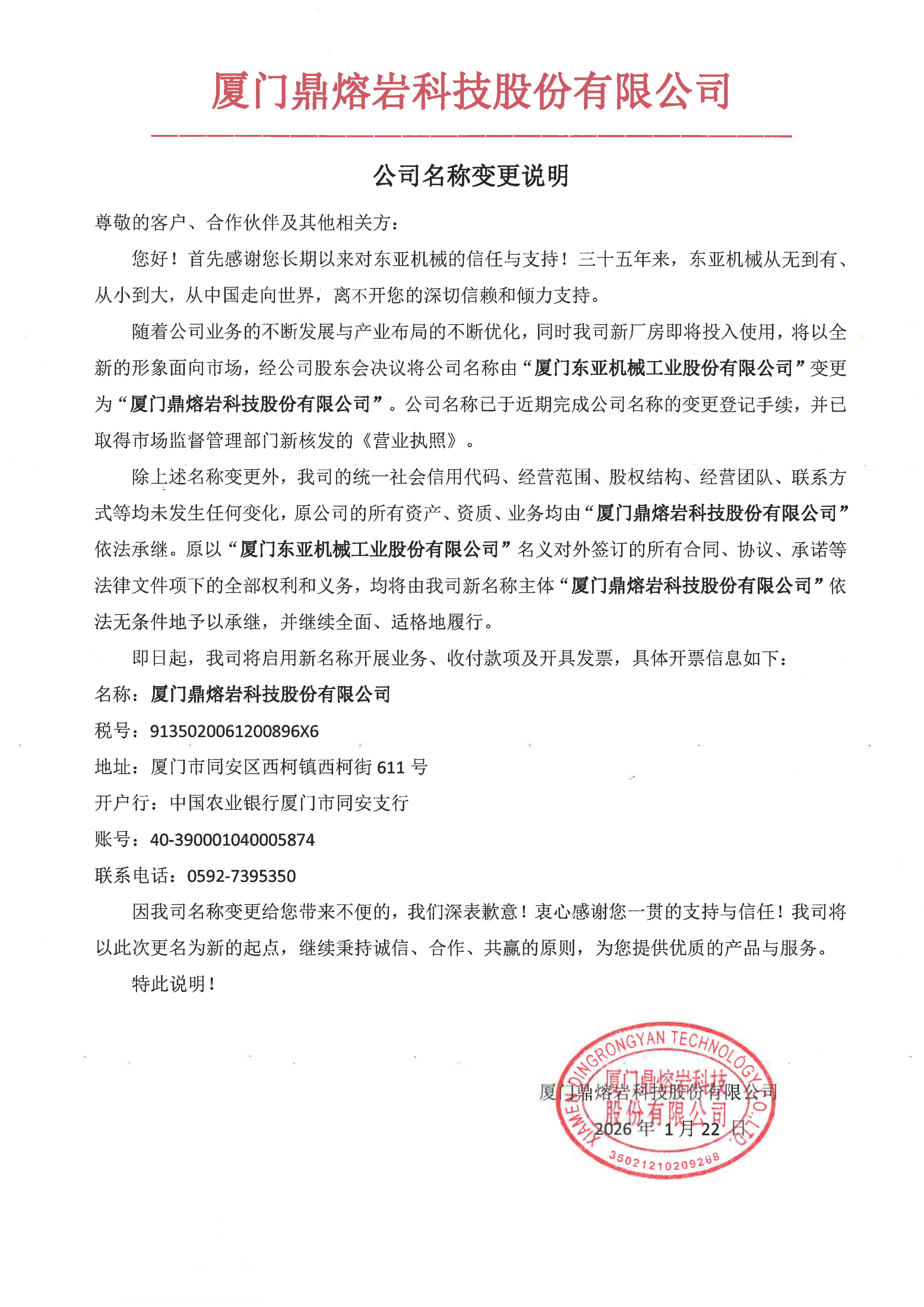 关于“东亚机械”更名为“以诚为本赢在诚信9001”的名称变更说明